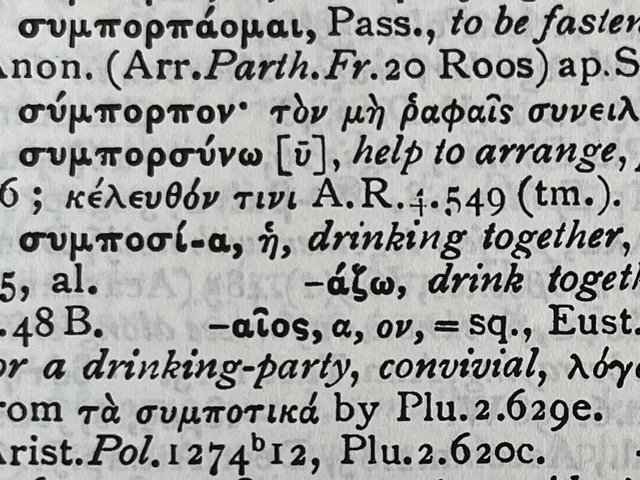 요즘에는 학회라는 의미로 쓰는 영어 단어 심포지엄symposium은 고대 그리스어συμπόσιον에서 왔습니다. 함께 마시는 자리라는 뜻입니다. 무엇을 마시는지 그것은 말하지 않아도 아시겠지요? (영어에서 명사 drink도 넓은 의미에서는 마실 것을 의미하지만 맥락에 따라 술을 의미하기도 합니다.) 그렇다면 함께 술을 마시는 자리라는 의미의 쉼포시온, 즉 향연이 어떻게 학회를 의미하게 되었을까요? 소크라테스가 술을 마시는 자리마저도 자유롭게 생각을 주고 받는 자리, 지식sophia에 대한 사랑philia을 드러내는 자리, 그러니까 철학philosophy하는 자리로 만들어버렸기 때문이겠지요.